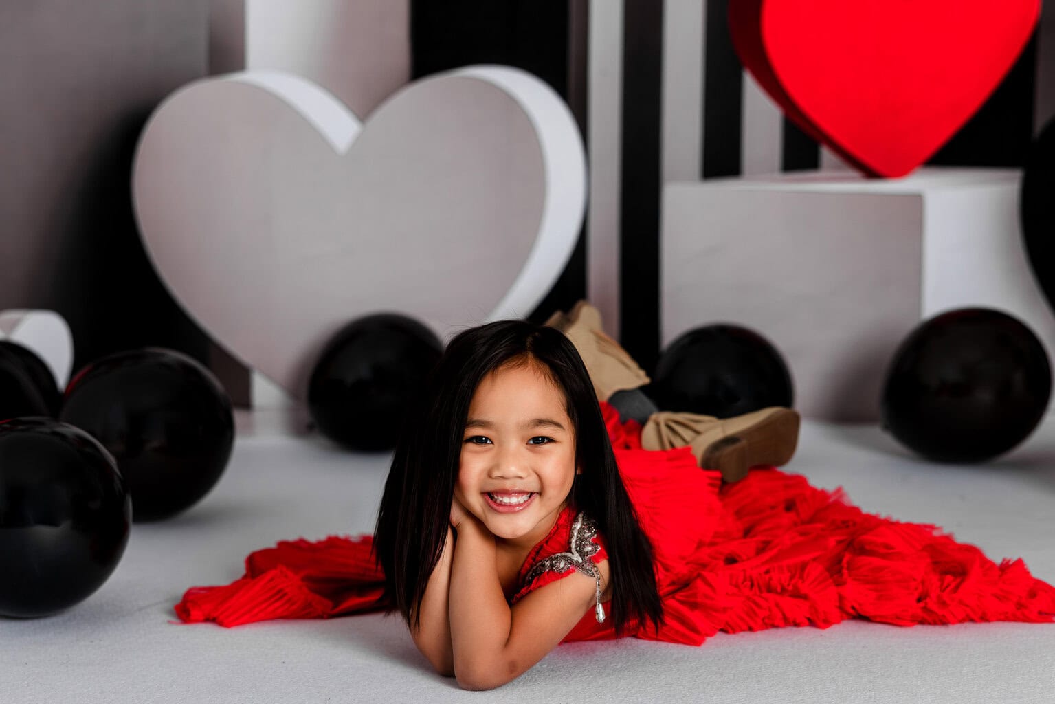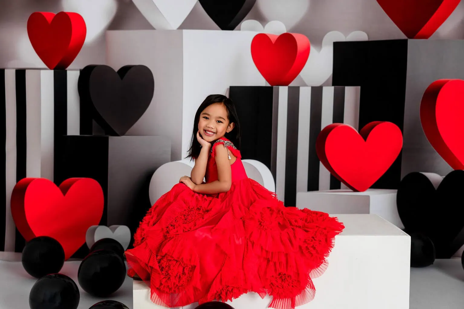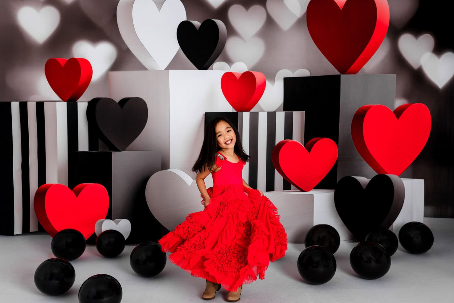 Celebrate Valentine’s Day with a modern, fashion-forward twist. Modern Love Valentine Minis feature a striking black, white, and red studio design with oversized hearts and clean architectural elements—creating a timeless yet playful backdrop for your little loves.