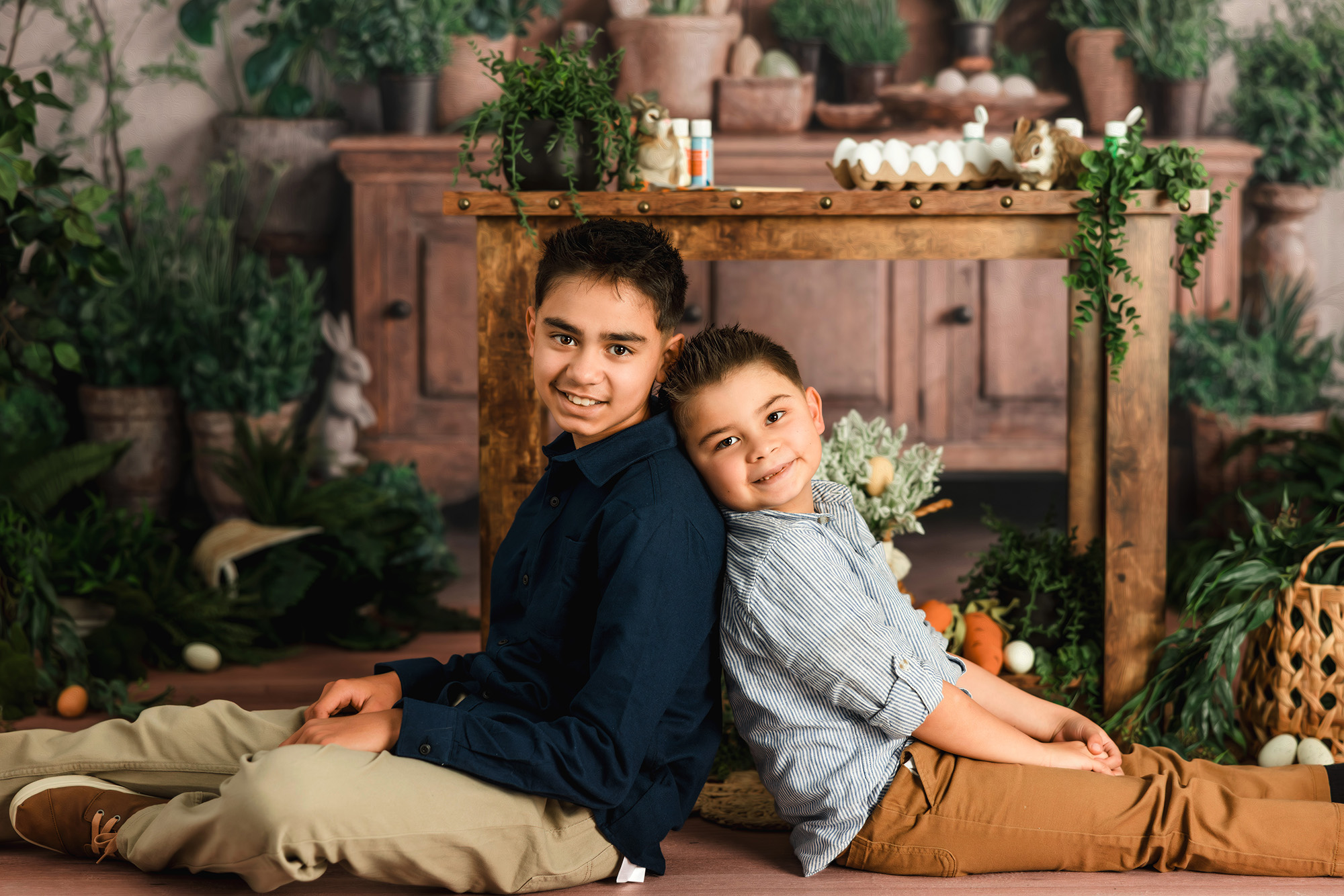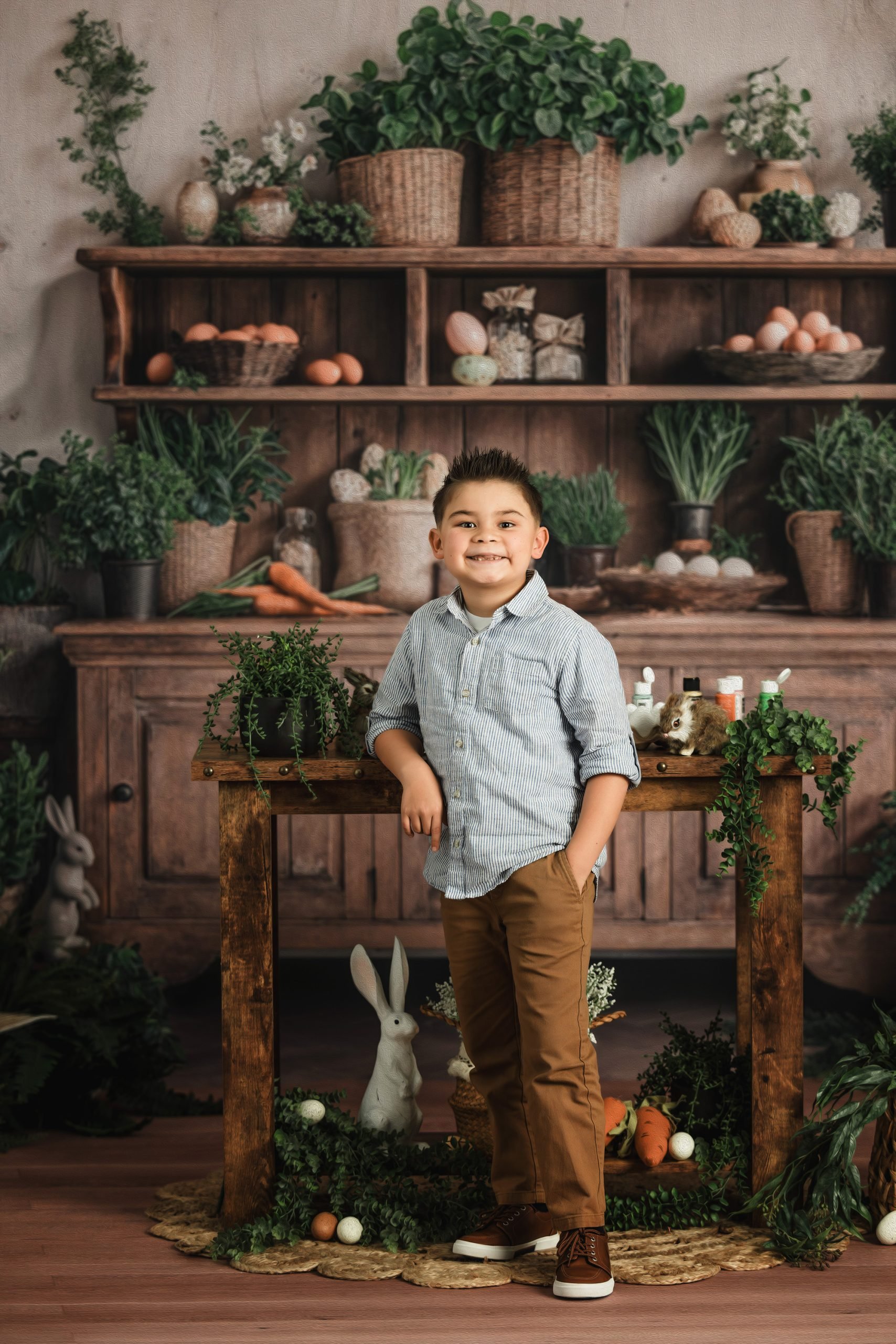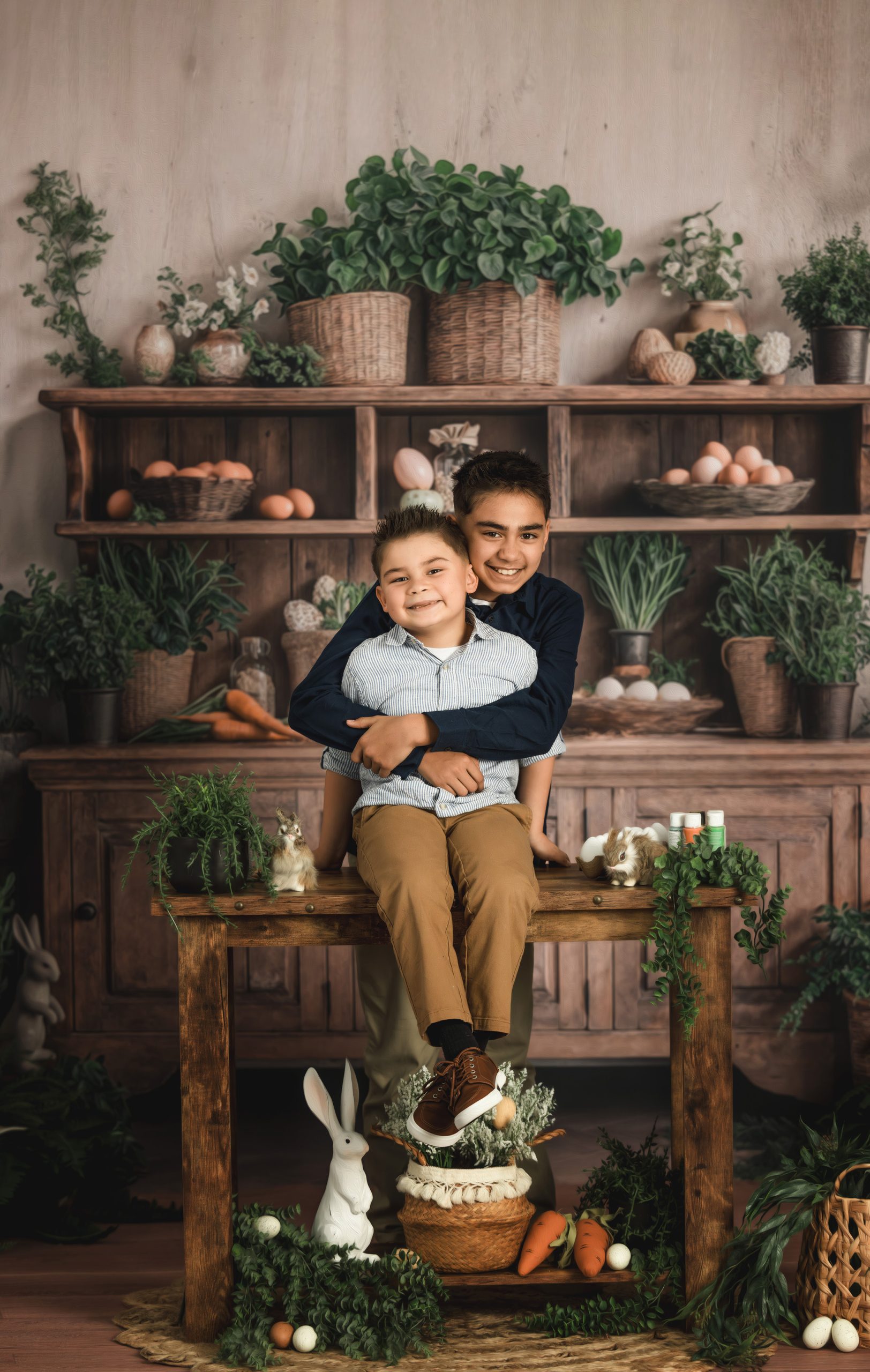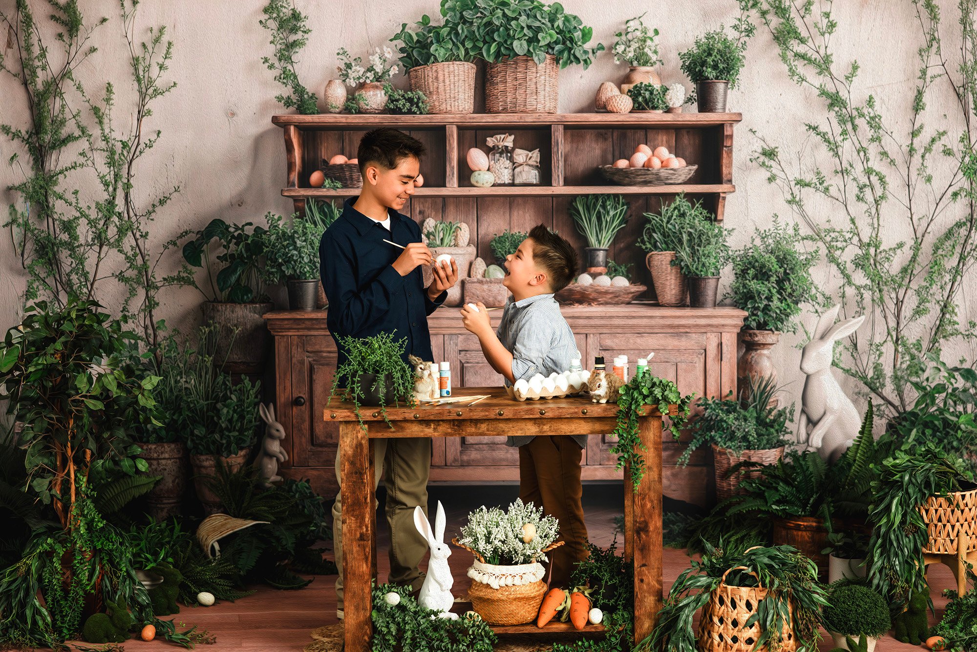 A charming Easter kitchen scene where kids color eggs, laugh, and make sweet memories. These minis focus on natural moments and classic Easter details in a rustic kitchen scene.
